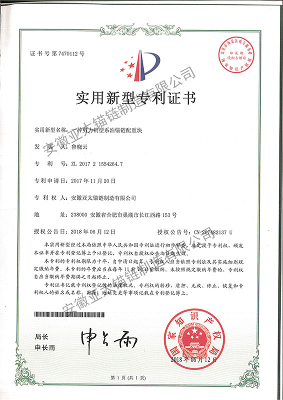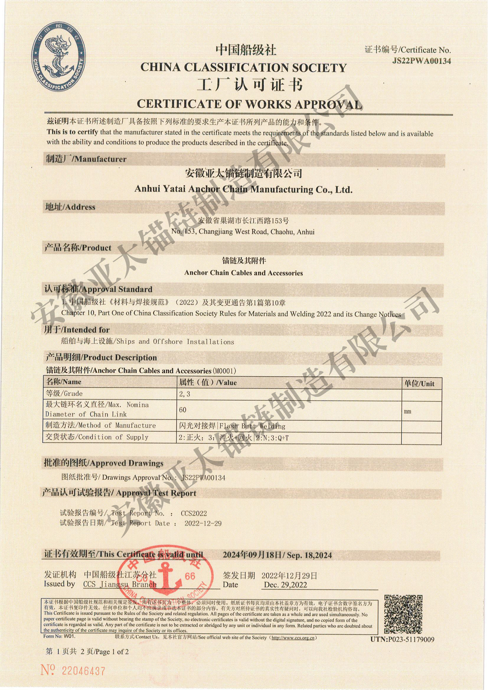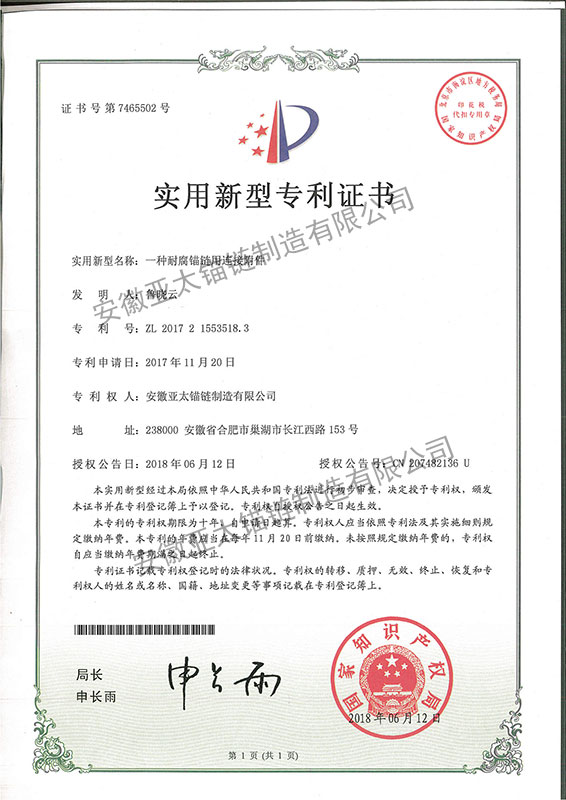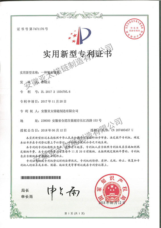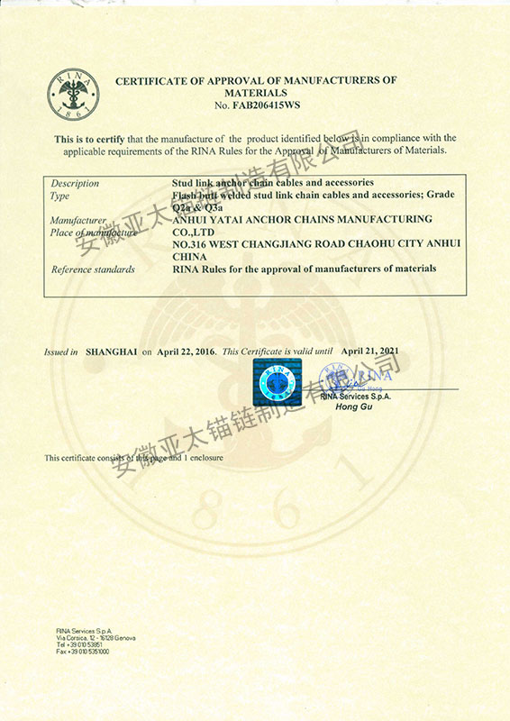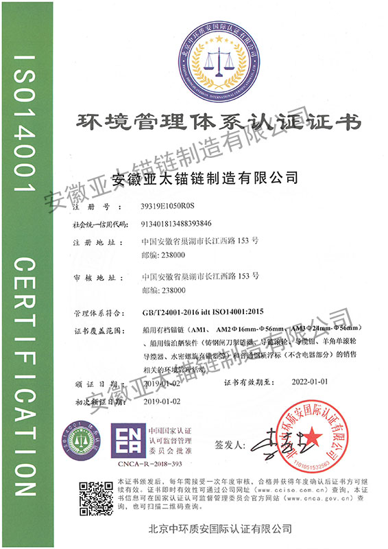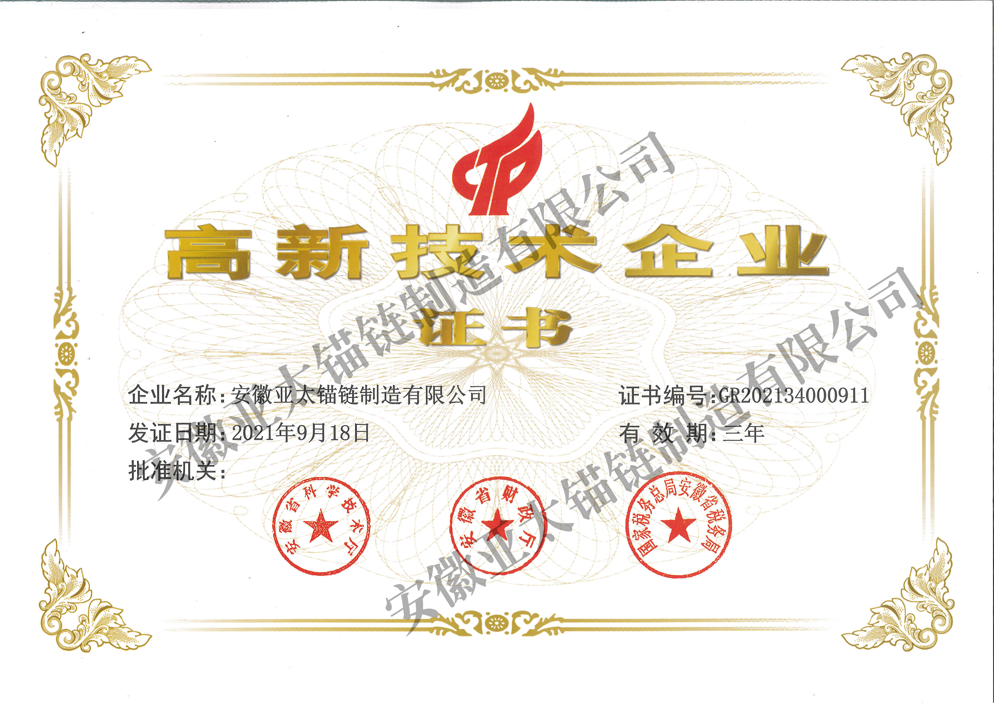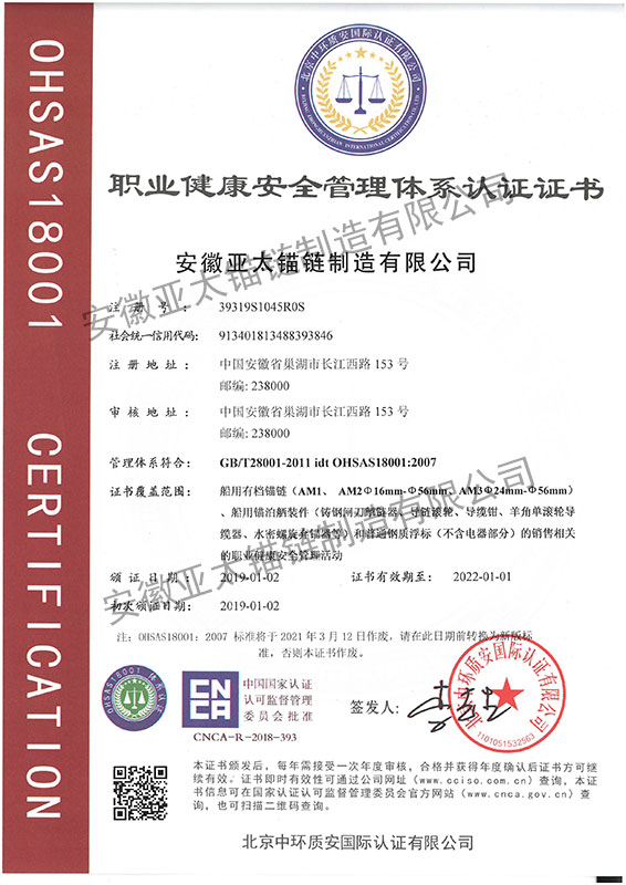 安徽亞太錨鏈制造有限公司是國家高新技術企業,也是國家GB/T 549-2017《電焊錨鏈》標準的起草和制定單位之一。公司旗下設有錨鏈分廠、浮標分廠、舾裝件分廠等多個分廠。公司專業從事φ12.5mm-φ107mm二、三級船用錨鏈、浮標錨鏈、錨鏈附件,錨、船舶曬裝產品、航標、系船浮、船型標、多種規(guī)格海洋監(jiān)測浮標及航標燈等產品的生產、安裝和服務。目前公司的產品銷往全國各地船廠、碼頭、航標處、航道局、海洋局,并已走上國際市場,如東南亞、中東、歐美等國家。
